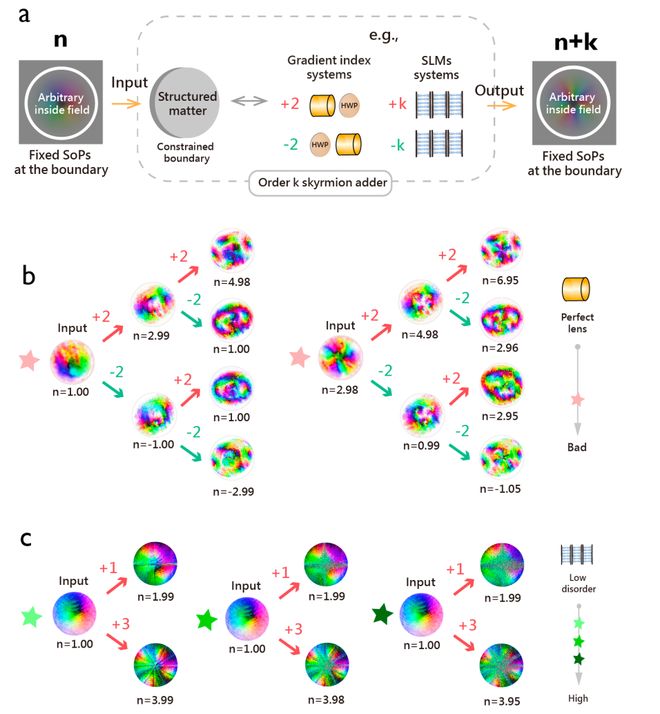 研究团队基于斯格明子的拓扑数,设计了一类特殊的结构化物质,实现了重要的基础逻辑单元——加法器(注:本文中“加法器”泛指加、减、乘、除等运算单元),以及给出了更复杂的逻辑运算方案,为后续基于斯格明子的光芯片设计铺平了道路。