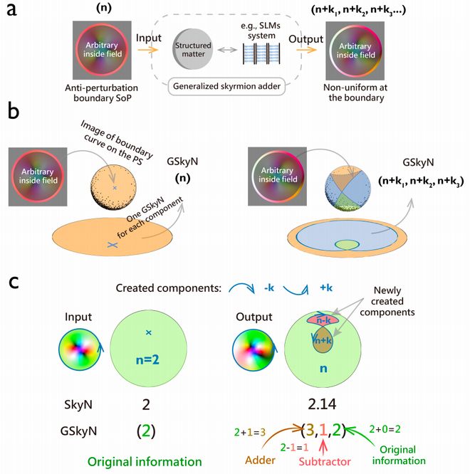 研究团队基于斯格明子的拓扑数,设计了一类特殊的结构化物质,实现了重要的基础逻辑单元——加法器(注:本文中“加法器”泛指加、减、乘、除等运算单元),以及给出了更复杂的逻辑运算方案,为后续基于斯格明子的光芯片设计铺平了道路。